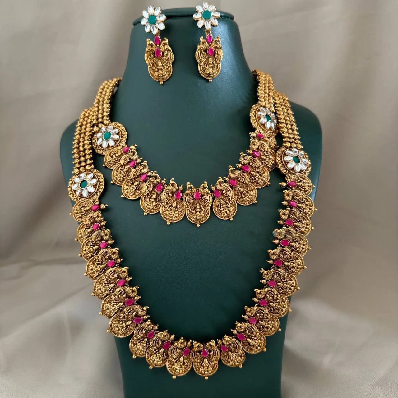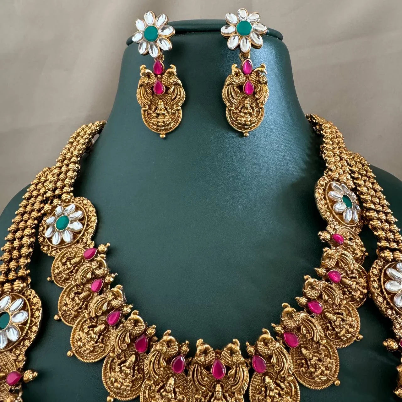 This necklace for the bride on her wedding day is a beautiful blend of antique and traditional designs. It’s a perfect bridal necklace for women who appreciate the charm of vintage jewelry. The emerald accents add a unique touch, making it a standout piece.