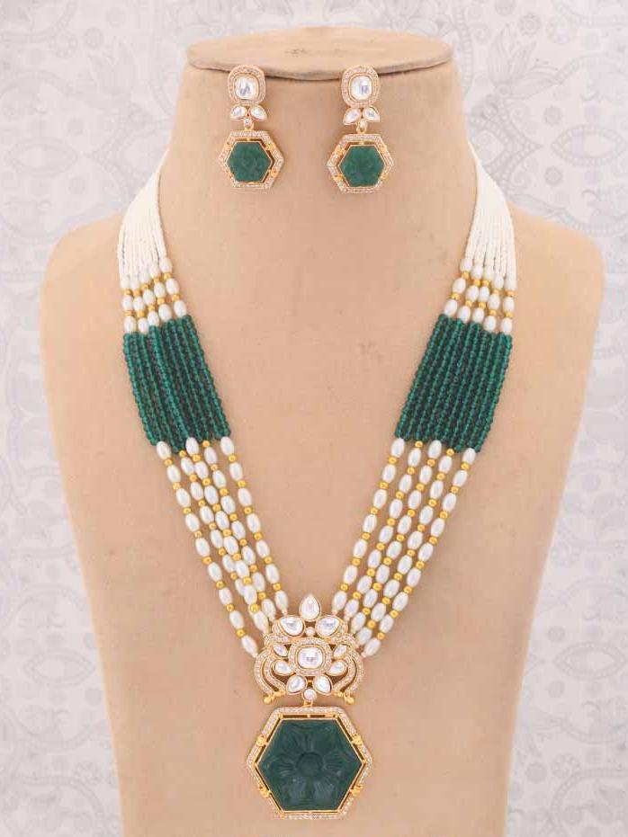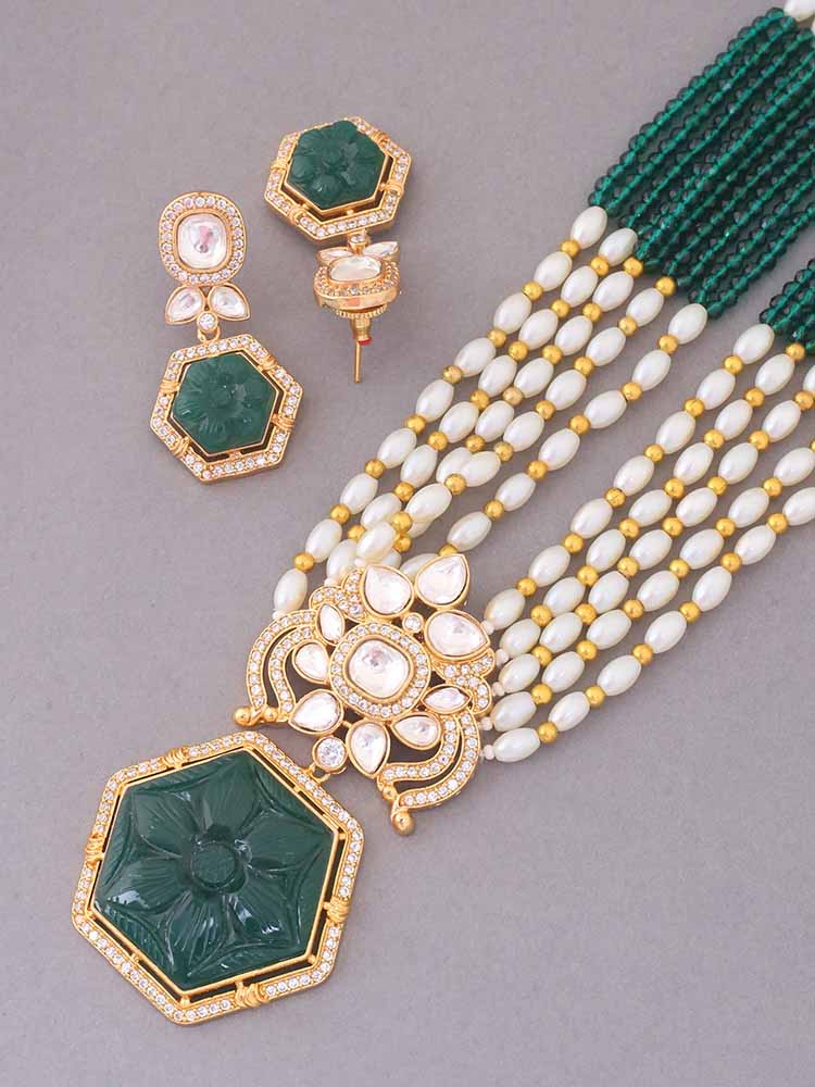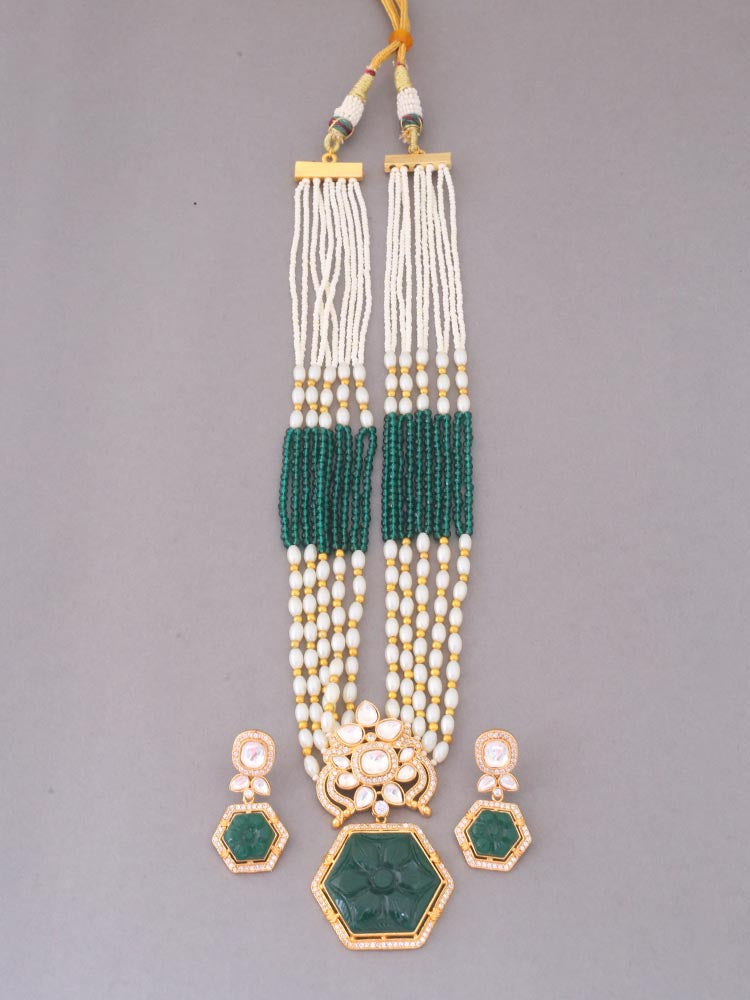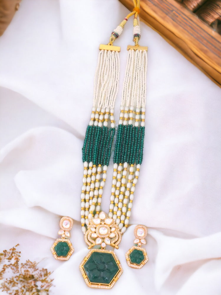 This necklace set is a combination of bright colours. The necklace set includes earrings, maangtikka and a necklace that will blow away every on-looker's mind with its charm and grandeur!