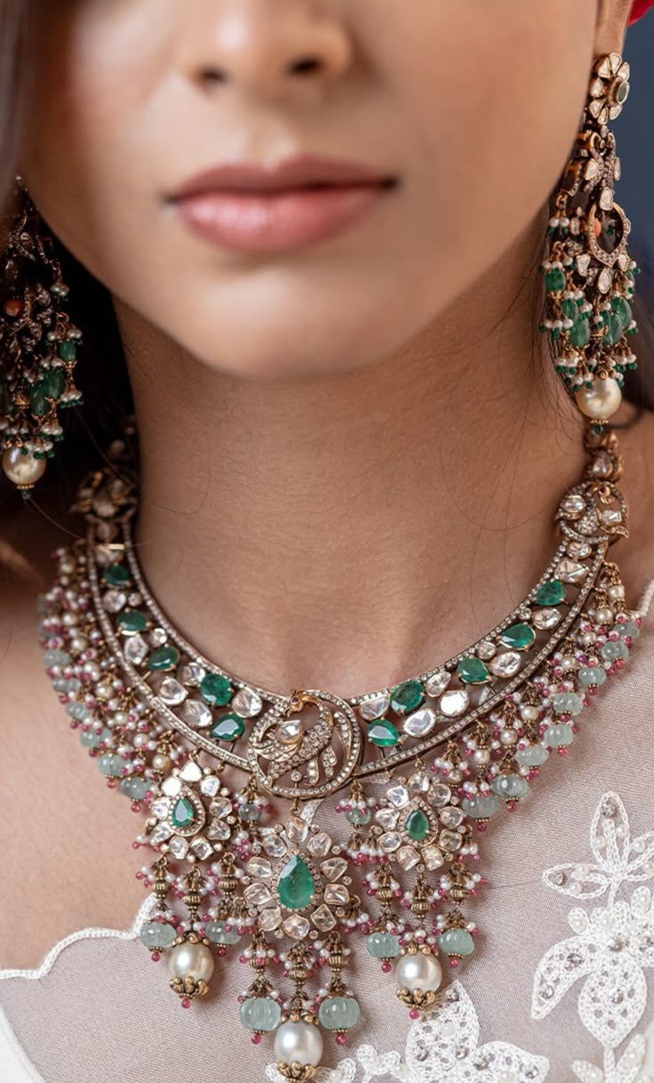 This necklace set is our sincere attempt to render the ethereal beauty of a peacock a visual expression. Embodying the elegance, suave and enchanting beauty of the peacock, the king of birds, this necklace is truly a masterpiece.